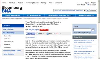 An article published on Bloomberg’s website BNA.com reported on recent changes to the tax laws that make some trusts’ previously-exempt net investment income taxable in 2014. According to the report, Adrienne Mikolashek, an attorney with the IRS Office of Chief Counsel, stated, “Once a trust distributes net investment income to a beneficiary under the Internal…